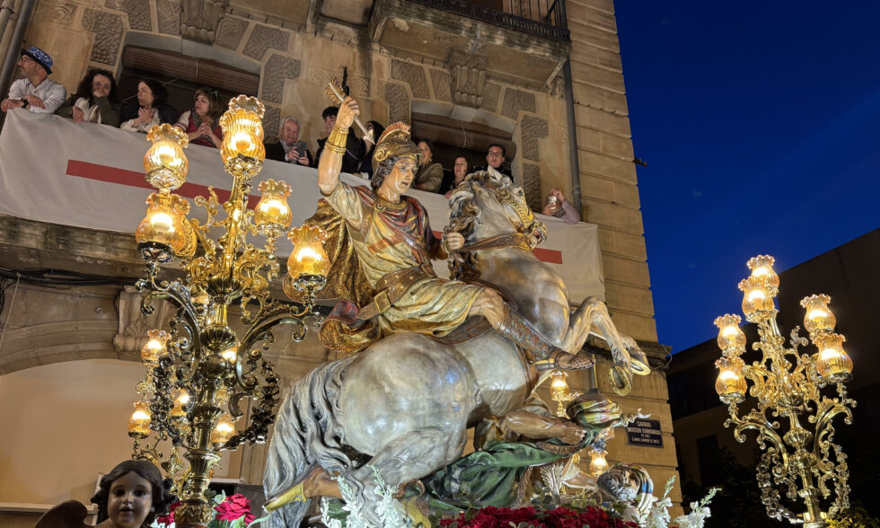 Les campanes de Santa Maria, Sant Mauro i el temple del Jesuset del Miracle han sonat amb força quan la imponent imatge eqüestre de Sant Jordi discorria al voltant d’ells en un any tan significatiu per a la ciutat, ja que celebrem el 750 aniversari del seu patronatge. S’han tornat a escoltar nombrosos visques al patró, destacant que darrere del conjunt escultòric també ha tingut una presència destacada la Relíquia. En la comitiva no ha faltat l’Assemblea General de l’Associació de Sant Jordi, amb el seu president Francisco García al capdavant, així com part de la Corporació Municipal encapçalada per l’alcalde Toni Francés.