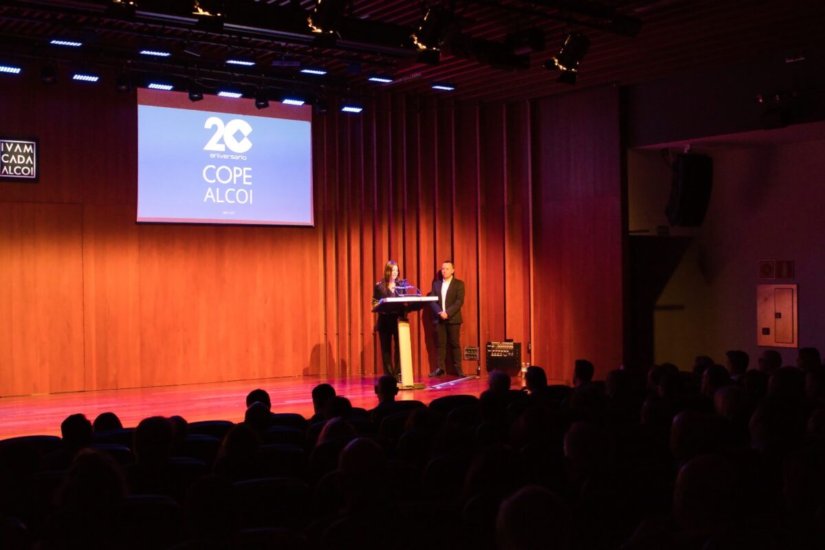 La gala, conduïda pel nostre company Gabriel Pascual, va reunir una àmplia representació de l’àmbit institucional de la ciutat i de les comarques, així com del teixit empresarial, econòmic i associatiu, junt amb treballadors, antics empleats i col·laboradors de la casa. L’acte va començar amb la intervenció de la directora de COPE ALCOY, Begoña del Prado, qui va expressar el seu agraïment a aquells que van impulsar el projecte fa dues dècades i va felicitar les persones que hui formen part de l’empresa vint anys després del seu naixement. Seguidament va prendre la paraula l’alcalde d’Alcoi, Toni Francés, que va destacar el paper que ha exercit COPE ALCOY des de 2005 en la ciutat i en el conjunt de les comarques, ressaltant també la importància dels mitjans de comunicació per a garantir una informació veraç i plural en la nostra societat. Posteriorment, i després d’un vídeo commemoratiu del vinté aniversari, l’emissora va realitzar un reconeixement a empreses, particulars i protagonistes que han sigut clau en la història de COPE ALCOY des de la seua creació fins a l’actualitat.