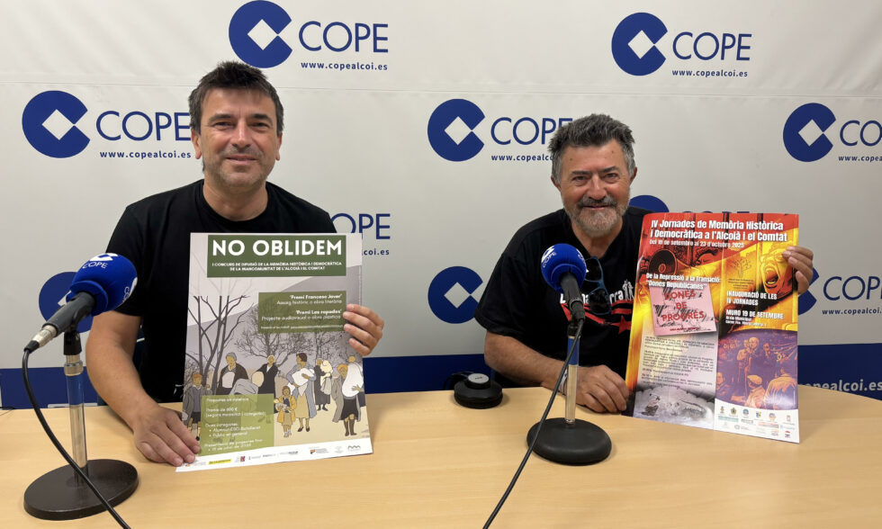 El ‘Fòrum per la Memòria Democràtica a Cocentaina’ organitza una nova edició de les consolidades ‘Jornades de Memòria Democràtica de l’Alcoià i el Comtat’. Bernardo Reig i Diego Fernández ens han acompanyat per a contar tots els detalls de la programació que es durà a terme a Alcoi, Cocentaina, Muro, Ibi, Benilloba i Alqueria de Asnar durant les pròximes setmanes.
