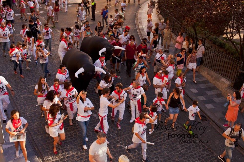 El singular acto comenzó a las siete y media de la tarde desde El Partidor con el pregón, el canto a San Fermín y el lanzamiento del cohete de aviso sin dejar de lado referencias a nuestro patrón San Jorge. El chupinazo, al igual que ocurre en la capital navarra, sirvió para dar el pistoletazo de salida a una carrera en la que no faltaron los toros; en esta ocasión hinchables y que incorporaban también una particular ambulancia que advertía de los peligros que podía acarrear el acariciar estos animales. Cientos de personas hicieron el trayecto de este encierro por las calles San Nicolás, San Lorenzo y País Valencià hasta confluir en la Plaza Ferrándiz y Carbonell. Allí, se llevó a cabo una fiesta con discomóvil que alargó la jornada hasta bien entrada la noche.