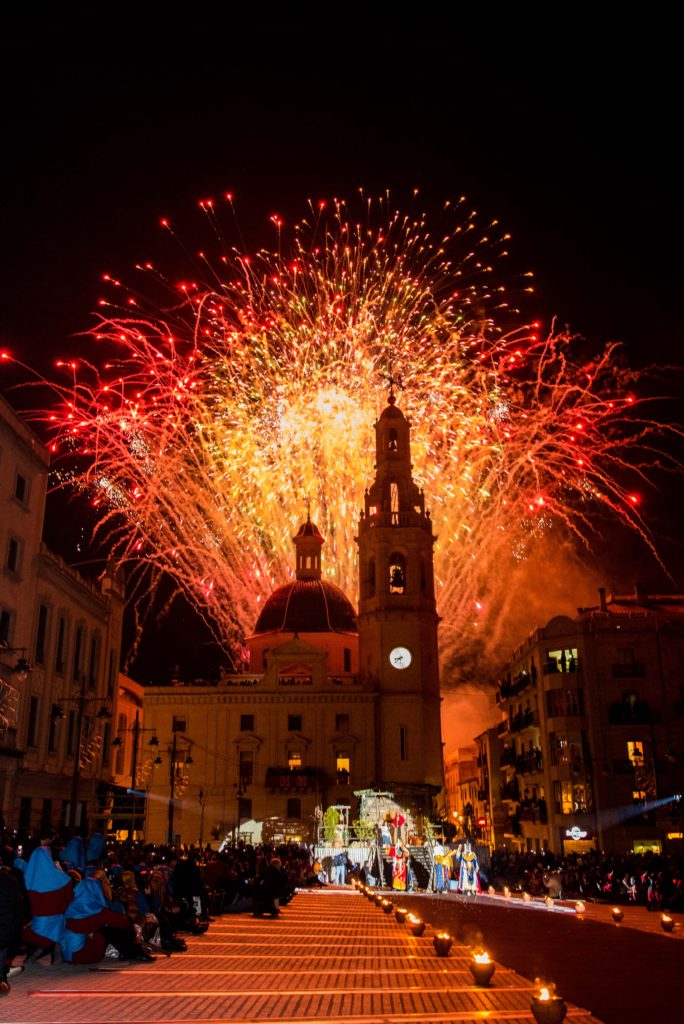 La Cabalgata ha comenzado a las seis de la tarde en la zona alta de El Camí y en la misma han tomado parte cerca de 2.000 personas en un desfile en el que no ha faltado la música tradicional, los bailes populares, el Embajador Real o centenares de antorcheros que han iluminado el camino a Sus Majestades. Los tres monarcas han recorrido la calle San Nicolás hasta llegar a la Plaza de España y allí, pasadas las 20:30h, ha tenido lugar la Adoración a la Sagrada Familia en la que Melchor, Gaspar y Baltasar han descendido de sus dromedarios para acercarse al centro de La Bandeja. A los sones de las campanas de la iglesia de Santa María y el ‘Aleluya’ de Haendel han recorrido solemnemente el breve trayecto hasta el portal instalado en el centro mientras se disparaba un vistoso castillo de fuegos artificiales.