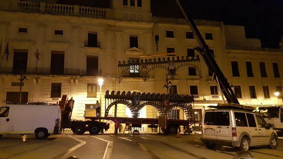 A dos meses vista del inicio de las fiestas de moros y cristianos de Alcoy, los operarios de la Brigada de Obras comenzaron ayer por la noche la instalación de la Enramada festera.