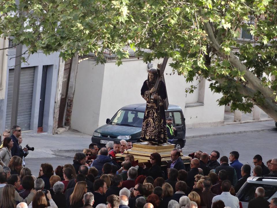 La Cruz de San Cristóbal abrió un año más la comitiva y dio paso al Gremio de los Conductores, los cuales portaron la imagen del citado San Cristóbal, cumpliendo así con una tradición única que tan solo se lleva a cabo en la Villa Condal. A continuación procesionaron los pasos de Jesús del Huerto, que aglutina a los constructores, el Cristo de la Columna fuertemente vinculado a los papeleros y el Ecce Homo que siempre ha representado al sector del textil. Tras ellos recorrieron las calles de La Vila las imágenes del Nazareno, que reúne a los comerciantes, la Dolorosa, vinculada desde siempre al calzado, y el Crist dels Llauradors cuya talla es una de las más antiguas de la Semana Santa Contestana ya que data del año 1.596. Finalmente el Cristo Yacente, acompañado por la Archicofradía del Santísimo Sacramento, cerró la procesión.