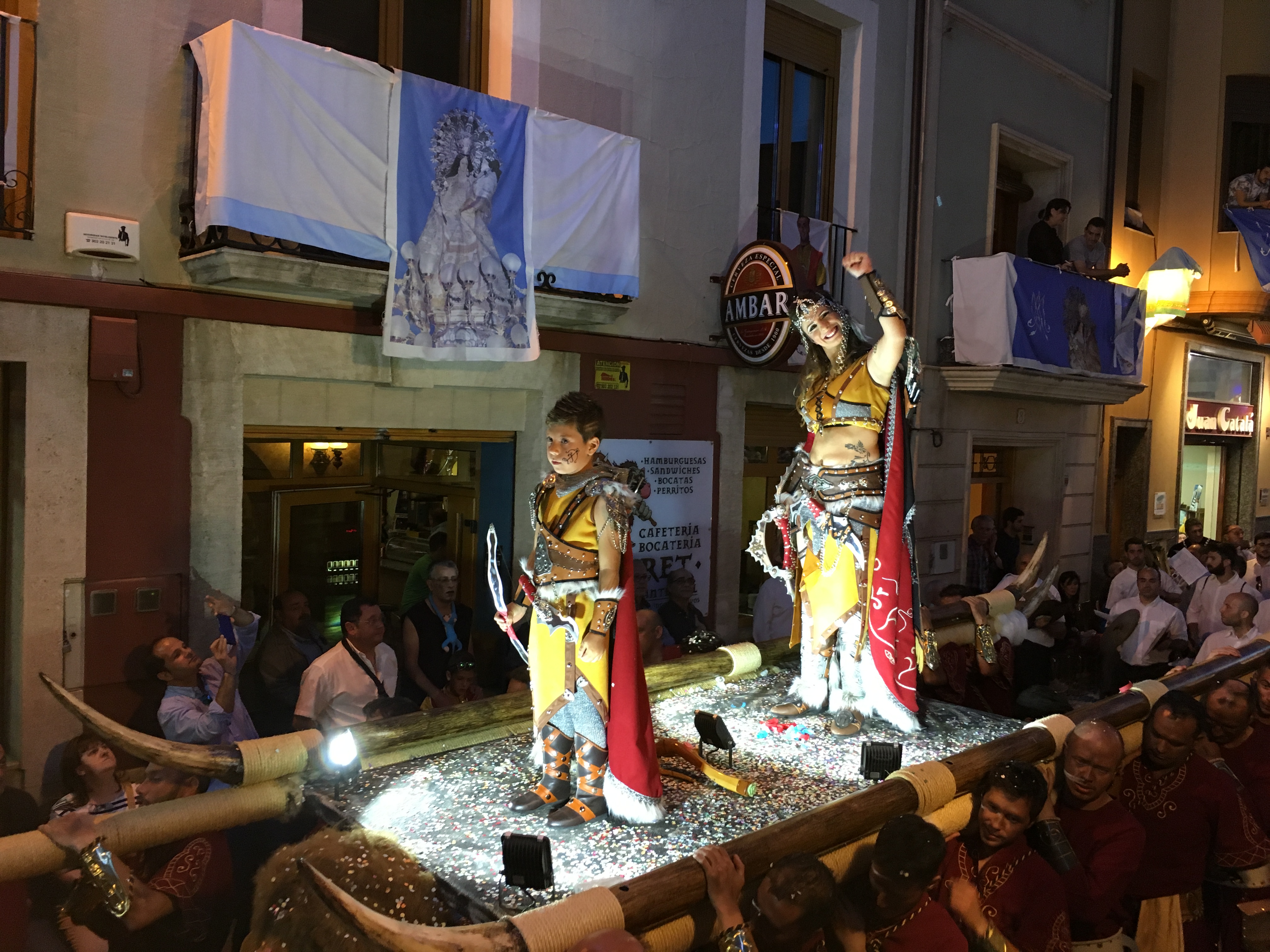 El colofón a la Entrada de Cristianos lo puso la Filà Arqueros con su joven abanderada de 22 años, Tamara Valls. La formación quiso hacer honor a su nombre en el boato de este cargo y por este motivo representó en las calles mureras la leyenda del mítico Robin Hood por medio de coreografías protagonizadas por animales en las que no faltaron los elementos de vegetación. La abanderada desfiló junto a su primo Daniel Vilaplana sobre una plataforma portada a hombros por esclavos y a los sones de la marcha cristiana ‘Veu i Ensenya’, del compositor de la vecina ciudad d´Ontinyent Saül Gómez i Soler. En cuanto al traje indicar que Tamara Valls portó un guerrero diseño con metales y predominio de los colores amarillos y rojos.