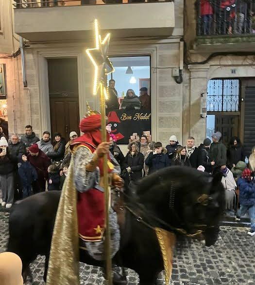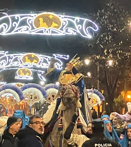 El desfile ha arrancado sin apenas lluvia a las seis de la tarde, tras una mañana marcada por las precipitaciones, y ha comenzado al inicio de El Camí como estaba previsto enfilando después la calle Sant Nicolau. La comitiva la han encabezado los heraldos de la ciudad seguidos del portador de la estrella a caballo, bailes populares e incluso la presencia del Embajador Real en su carroza ayudado este año por el actor alcoyano Pau Durà. A continuación, y en una parte central, han desfilado Melchor, Gaspar y Baltasar sobre sus camellos acompañados por un gran séquito de ayudantes, antorcheros y portadores de elementos identificativos de cada monarca. Pese al mal tiempo, las calles del Centro estaban completamente abarrotadas de público y los Reyes Magos no dejaron pasar la oportunidad de saludar a centenares de pequeños e incluso mostrarles a los más pequeños su afecto en forma de besos y abrazos.