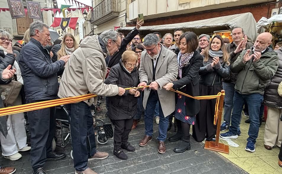 El certamen ha sido inaugurado oficialmente esta mañana después de que en la tarde de ayer comenzara a funcionar la actividad comercial del Mercado Medieval y se abrieran también las diferentes exposiciones que dan forma a la oferta cultural que presenta este año el certamen. La jornada ha estado condicionada por la adversa climatología, ya que ha amanecido con lluvia y frío, pero a la hora del inicio del acto inaugural tan solo estaban los cielos cubiertos con alguna fina llovizna en algún momento que no ha impedido el desarrollo de la habitual ceremonia. Esta ha dado inicio en la Placeta Molina ante el Ayuntamiento, pasadas las once y media de la mañana, y ha arrancado con un homenaje a la firma ‘Electromur’ en reconocimiento a la trayectoria empresarial que desde hace décadas desempeña tanto en la localidad como en el conjunto de la comarca. A continuación, se ha interpretado el Himno del Tío Pep, y se ha procedido al corte de la cinta a cargo de Mª Carmen Sanjuan Llorens, una de las personas más mayores de Muro en estos momentos.