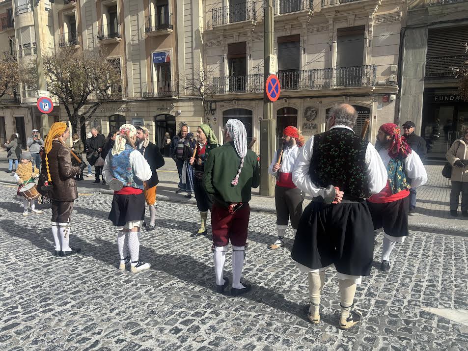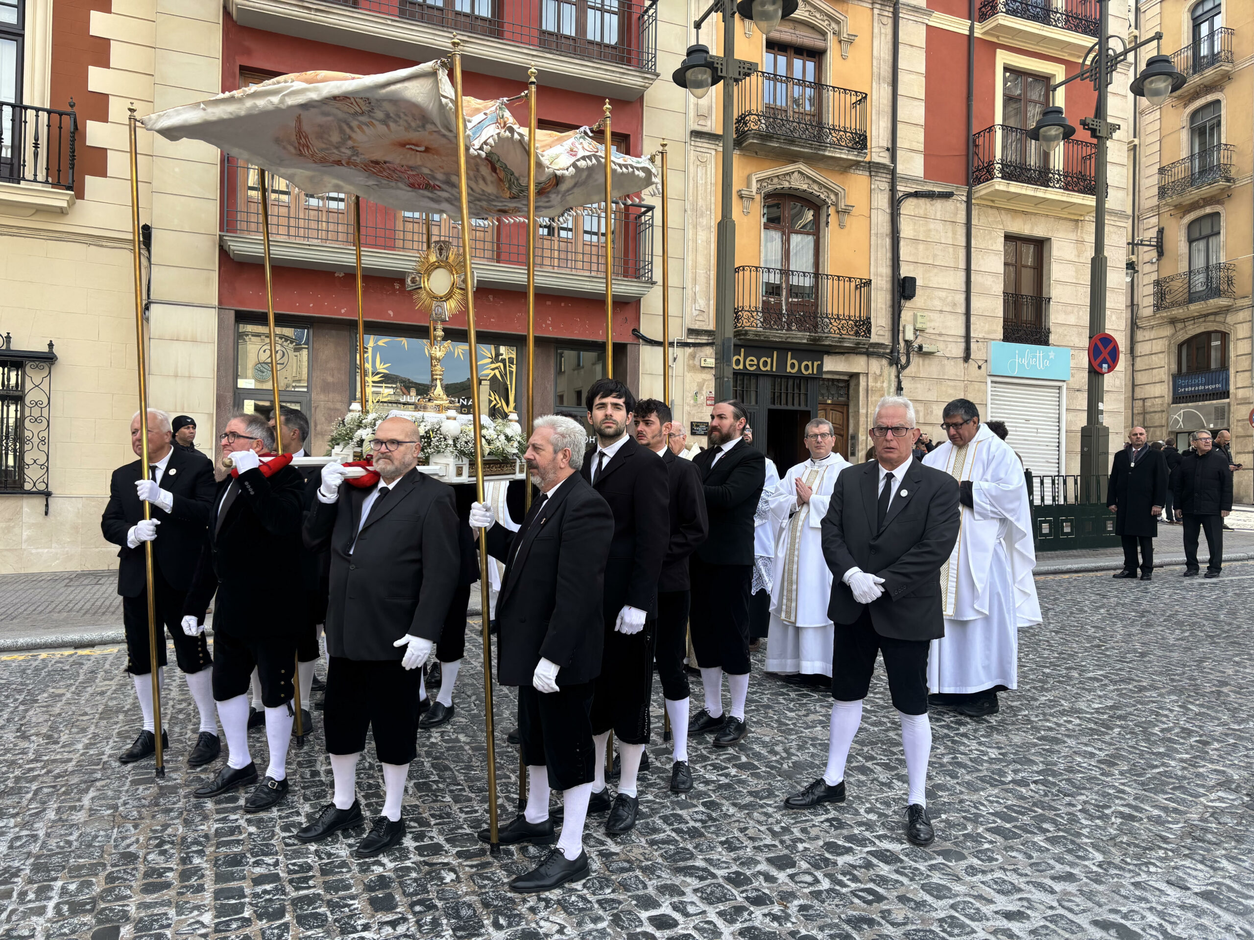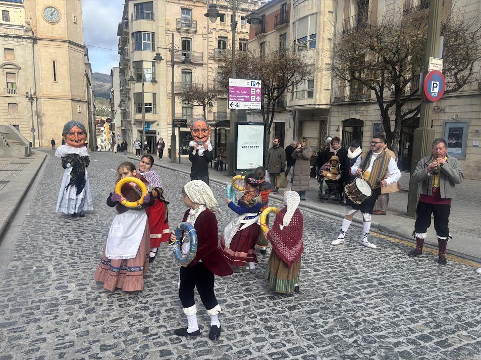 La mañana avanzó con la procesión por las calles del Centro, marcada este año por las fuertes rachas de viento, pero que no impidió la celebración de la misma. El Grup de Danses Sant Jordi, con sus bailes populares, abrió la comitiva en la que estuvieron presentes las asociaciones religiosas de la ciudad junto a la imagen del Jesuset del Miracle y el Santísimo Sacramento bajo palio portado por el Gremio de Labradores. Durante el acto se realizaron varias paradas de adoración al mismo Santísimo, en varios altares repartidos por las calles en las que transcurrió la mencionada procesión, y esta última terminó en el interior de Santa María mientras la Colla de Campaners d’Alcoi hacia voltear con fuerza los bronces del templo.