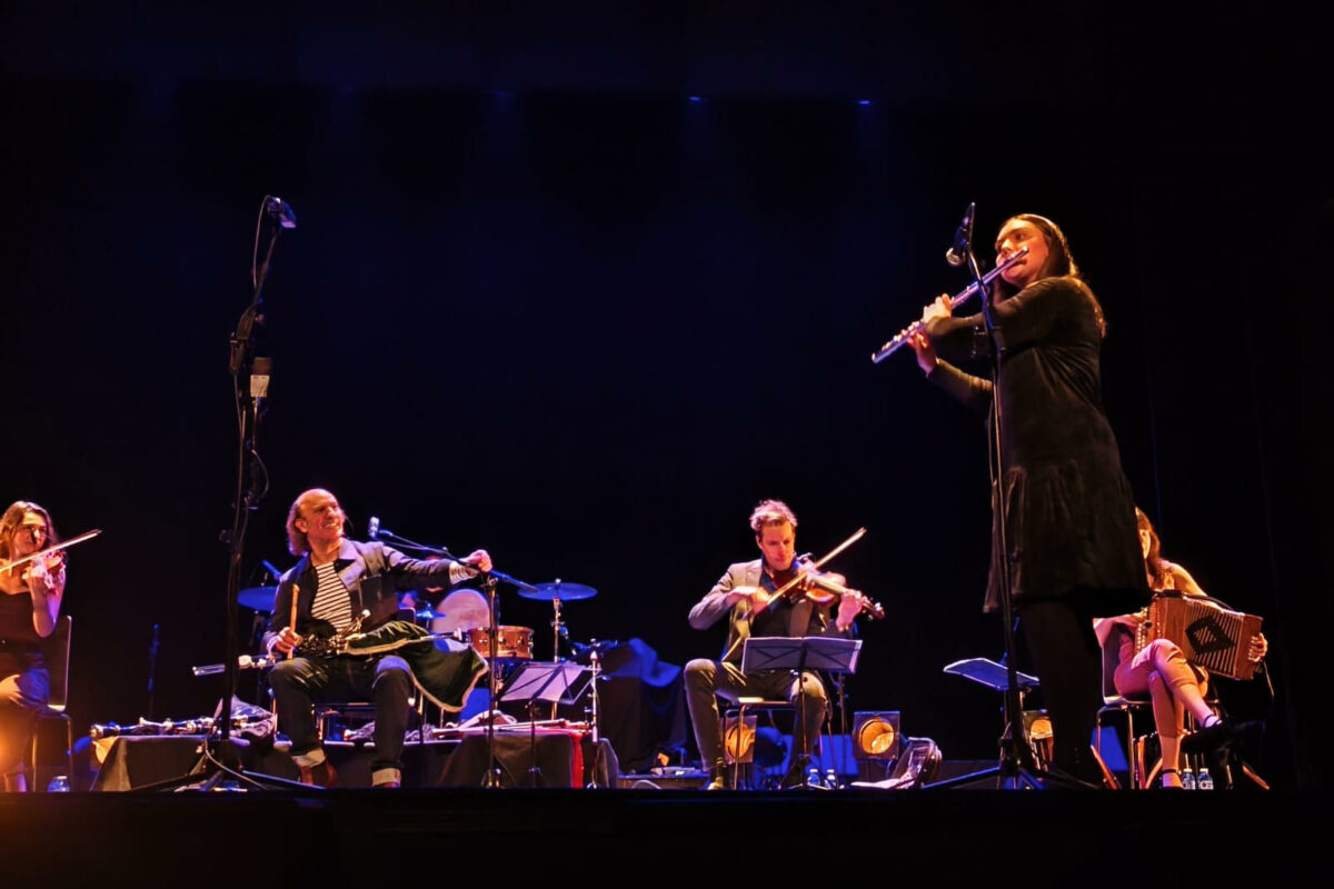 Este pasaje musical fue concebido como un homenaje a The Chieftains y, de manera especial, a su fundador y alma del grupo, Paddy Moloney, fallecido en 2021. Para recrear la esencia de la obra, Carla unió su flauta travesera al tin whistle de Carlos Núñez y a los violines de María Sánchez y Jon Pilatzke, miembro de The Chieftains presente en el escenario, acompañados por la trikitixa de Itsaso Elizagoien, la percusión de Xurxo Núñez y la guitarra de Pancho Álvarez. La presencia de nuestras comarcas se completó con la participación del grupo La Xafigà de Muro, habitual en las visitas de Carlos Núñez a la provincia desde hace más de una década, gracias a una estrecha colaboración entre ambas formaciones les ha llevado incluso a compartir escenario en el prestigioso Festival Intercéltico de Lorient, en Francia.