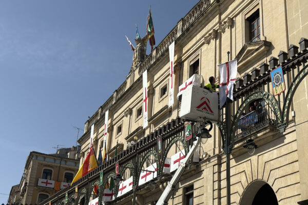 A la decoración habitual se le van a sumar ornamentos especiales con motivo del 750 aniversario del patronazgo de San Jorge y algunos de ellos ya empiezan a ser visibles. Por un lado, el pasado domingo se desplegaron unos pendones alusivos a la efeméride desde la azotea del Ayuntamiento antes del arranque de La Gloria mientras que hoy se han colocado unos estandartes con los emblemas de la cruz y la media luna sobre las almenas del tramo de Enramada situado en la Plaza de España. Estos banderines se recuperan de nuevo, ya que antes se colocaban en la plaza, mientras que en las farolas del céntrico enclave va a montarse también una decoración especial que emulará aquellos elementos vegetales con los que se confeccionaban las Enramadas en décadas pasadas.