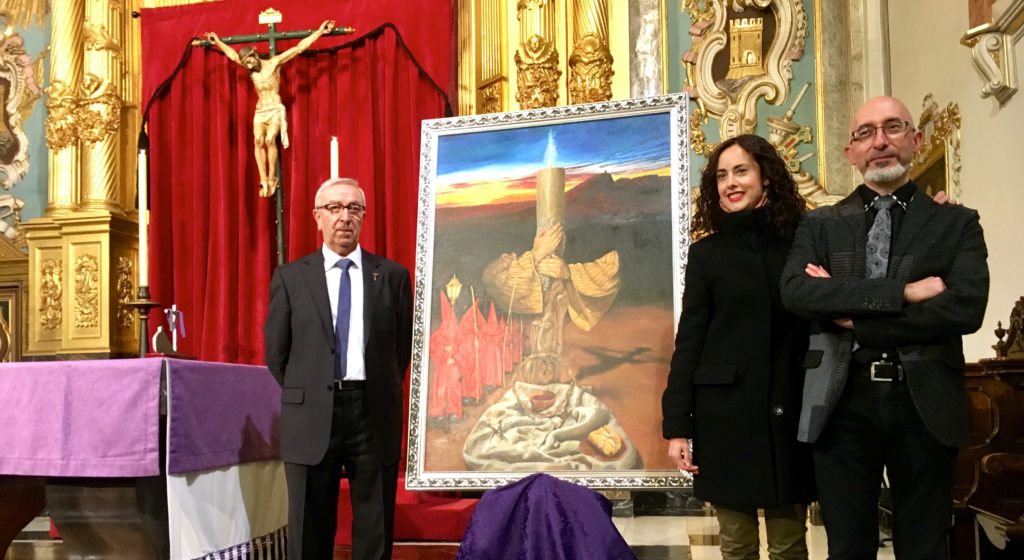 En primer lugar se procedió el descubrimiento del citado cartel, una obra en la que destaca el Castell así como la Serra de Mariola al fondo y en el que se hace un guiño a la citada Cofradía del Ecce Homo “he plasmado a sus penitentes con el color rojo y la caña que les identifica así como otros elementos de la pasión como el pan, el vino, la corona de espinas o los clavos. En la parte central encontramos unas manos que abrazan la cruz y el cirio pascual, unos símbolos que nos muestran el camino de la pasión y muerte hasta la resurrección”, explicó el autor. A continuación Francisco Miralles pronunció el pregón en el que hizo referencia a su vinculación a la Cofradía de la Dolorosa y en el que habló de los actos que dan forma a la Semana Santa de la Villa Condal relacionándolos con los diferentes pasos que toman parte en cada procesión. De igual forma hizo una mención a la figura de Sant Cristòfol para remarcar la singular tradición que existe en Cocentaina y que consiste en que el patrón de los conductores abra la procesión del Viernes Santo dando paso al resto de Cofradías “es una costumbre única de nuestro pueblo y por eso la he querido remarcar. Estoy muy agradecido a la Junta Central de Cofradías por haber pensado en mí para ser el pregonero de este año”, afirmó el protagonista.