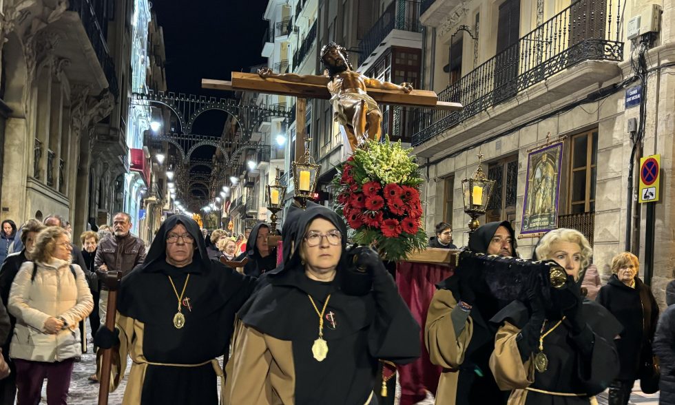 Al llamado Triduo Pascual llegamos después de la emotiva procesión del Vía Crucis que tuvo lugar pasadas las ocho de la tarde de ayer, Miércoles Santo, tras finalizar la misa en la parroquia de San Mauro y San Francisco. Desde allí salió la imagen de Cristo Crucificado, acompañada por fieles y devotos, para recorrer la calle Sant Nicolau y la Plaza de España hasta finalizar en el interior de la iglesia de Santa María. Durante el trayecto se hicieron 14 paradas para rezar las correspondientes estaciones del Vía Crucis, las cuales estuvieron representadas en banderines que portaron representantes de las Cofradías del Cristo Yacente y la Virgen de los Dolores o del Cristo Agonizante, así como el Gremio de Labradores. Don Jesús Fuentes, como titular de las Parroquias del Centro, presidió la procesión junto a una representación de las entidades religiosas de la ciudad y del Ayuntamiento.