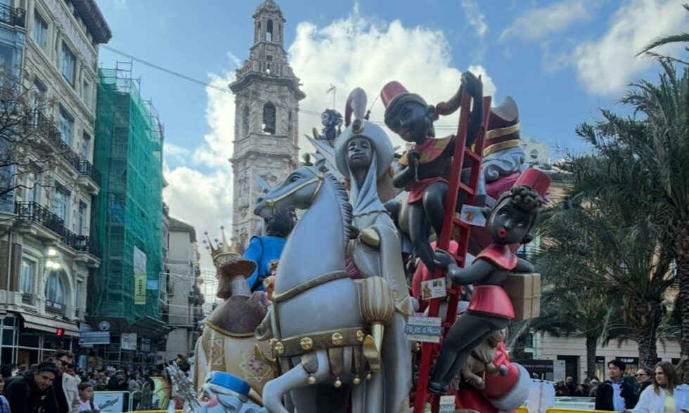 Los vecinos de Alcoy y de otras localidades de la comarca que han visitado estos días las Fallas de Valencia se han encontrado con una escena que no ha pasado desapercibida: una representación de la Cabalgata de los Reyes Magos de Alcoy en pleno corazón de la ciudad. La escena forma parte de la Falla Tío Pep, ubicada en la céntrica Plaça de la Reina, entre las torres de Santa Catalina y el Micalet.
