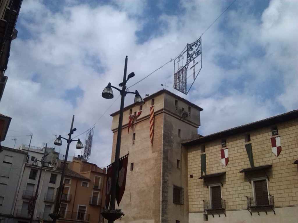 Las calles por donde discurren los principales actos de las fiestas de moros y cristianos de Cocentaina se ha engalanado en los últimos días para recibir el paso de los festeros y visitantes. La pasada semana se colocaron por el Passeig del Comtat y la plaza del Pla banderines con los emblemas de las quince filaes que se han instalado anclados a las farolas del mobiliario urbano. Además la fachada del Palau Comtal luce con estandartes que confieren un aspecto medieval a uno de los principales edificios históricos de la Villa Condal. Por su parte en el Passeig del Comtat se ha montado la iluminación extraordinaria que este año reproduce escudos con los símbolos de la cruz y la media luna así como el castillo de Cocentaina. Los arcos se encendieron el pasado sábado sábado coincidiendo con el día dels Comptes.