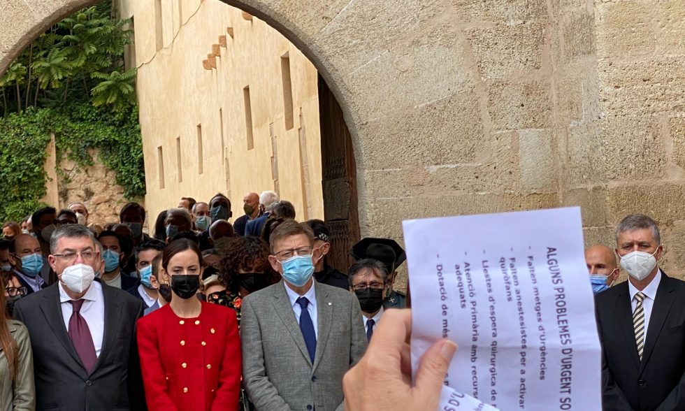 Un buen número de médicos y diversos profesionales de la salud pública, ataviados con su correspondiente bata blanca, se personaron a las puertas del Palau Comtal para recibir a las autoridades que iban a inaugurar la Fira. De esta forma expusieron la problemática de nuestro Departamento Sanitario en unos panfletos que mostraron ante el Presidente de la Generalitat Valenciana (Ximo Puig), el Presidente de Les Corts (Enric Morera), los Consellers presentes en el acto y el resto de representantes políticos. Muchos ciudadanos aplaudieron la acción reivindicativa y desde el colectivo de médicos lamentaron después en redes sociales que el Gobierno Autonómico apenas escuchase sus demandas.