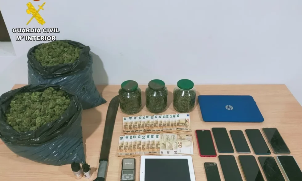 Durante la intervención han sido intervenidas 573 plantas de marihuana4,5 kilogramos de cogollos de marihuana secos, 1.400 euros en efectivo, un machete, dos cuchillos y dos aerosoles de pimienta. También se han incautado de dos vehículos y gran cantidad de material para el cultivo.