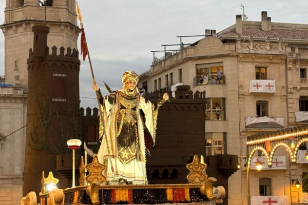 Ana Gisbert lucía un cuidado diseño, que han hecho posible Juan Climent y Creaciones Germanísimo junto a Mónica Jover, y ha estado acompañada por la Agrupación Artístico-Musical ‘El Trabajo’ de Xixona interpretando al lado de la Xafigà de Muro la emblemática pieza Kapytan del compositor de Ontinyent Saül Gómez i Soler. A ella le han precedido danzas tribales, grupos de percusión, incensarios y ballets abriendo paso a la guardia personal de confianza de la protagonista, los conocidos como Muharibs. Hombres y mujeres, con ricas vestimentas de tonos blancos y rojos, que han estado junto a la Alférez desfilando por las calles de la ciudad sobre camello. Y tras ellos Ana Gisbert, lanza en mano, con una rica vestimenta en la que sobresalía el color blanco junto a metales, pedrería y algo de cuero.